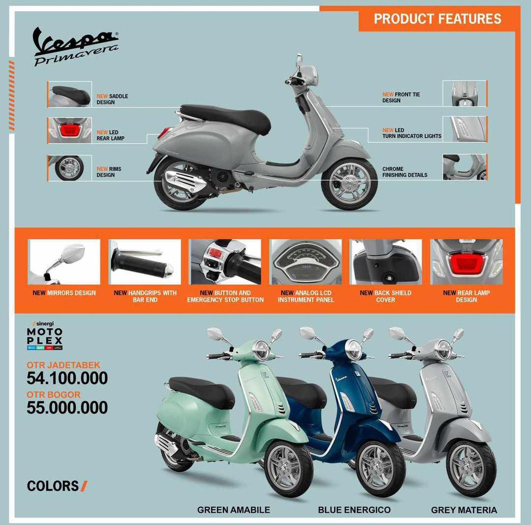 Vespa Primavera S – Produk ini istimewa, karena termasuk edisi khusus dan memiliki berbagai detail yang berbeda dibanding Primavera standar. Alhasil, penampilan motor ini terlihat jauh elegan. Terutama berkat penambahan aksen abu-abu di beberapa bagian bodinya.